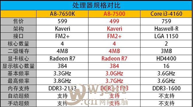 由于CPU平臺不同,因此測試使用了兩款不同主板,A8-7650K與A8-7500都默認支持2133MHz頻率內存,而Core i3-4160則僅能支持到DDR3-1600標準。