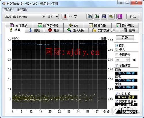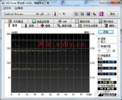 在USB3.0接口下,閃迪CZ80 USB3.0優(yōu)盤在該軟件下的讀取表現(xiàn)為:最低傳輸率176.9MB/秒,最高傳輸率179.3MB/秒,平均傳輸率179MB/秒,這樣的速度你見過嗎?在USB2.0接口下,閃迪CZ80 USB3.0優(yōu)盤在該軟件下的讀取表現(xiàn)明顯下降,平均速度在33MB/S。但是,仍然比大部分USB2.0優(yōu)盤速度更快。