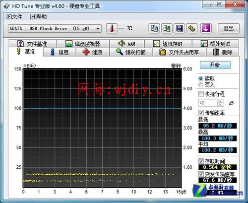 在USB3.0接口下,威剛S107 USB3.0優(yōu)盤的最大讀取速度達(dá)到了100.3MB/S,最低速度也在95.2MB/S,平均速度在100.2MB/S,表現(xiàn)相當(dāng)不錯(cuò)。在USB2.0接口下,威剛S107 USB3.0優(yōu)盤速度也在33MB/S以上,比一般USB2.0優(yōu)盤快。