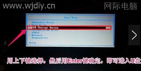 2,進(jìn)入到快捷啟動(dòng)菜單后,選擇USB Storage Device這一項(xiàng),中文意思是“U盤(pán)存儲(chǔ)盤(pán)”,尤于版本不同可能會(huì)有所差別,有的可能直接是U盤(pán)的名稱,網(wǎng)際電腦來(lái)說(shuō),一般帶有USB一類詞匯的就是U盤(pán),然后按Enter鍵,就能馬上從U盤(pán)啟動(dòng),當(dāng)然,你得在開(kāi)機(jī)前就要把U盤(pán)插上才可以。