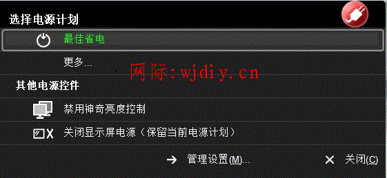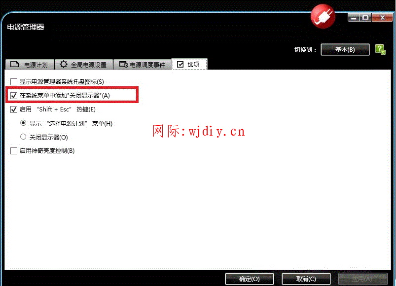 若菜單中無此選項,可通過電源管理軟件“選項”卡,勾選“在系統菜單中添加"關閉顯示器"(A)”即可。