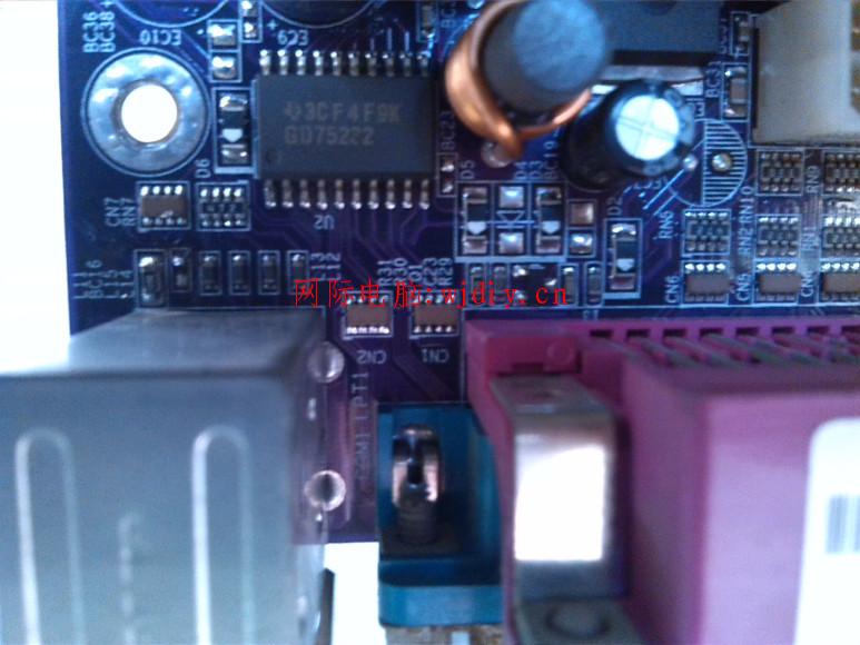 好了,現在把電烙鐵插上,把焊錫和鑷子備好,用烙鐵把焊錫镕在貼片電容的兩端,用烙鐵燙錫镕后即可用鑷子把電容取出,把板上的剩余焊錫清理干凈后就可以了。你不必再裝上電容就可以用了。對于鼠標接口也是如是處理即可。我這樣修復過上百塊有類似故障的主板,90%以上都可以這樣修復。今天也是這樣修好ps2接口的!可錢還沒到手!