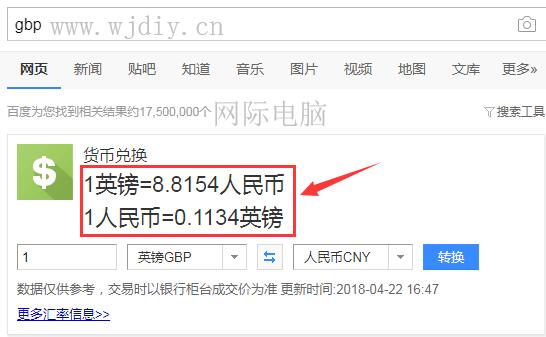 另外大家如果想了解1英鎊可以兌換多少人民幣,可以直接在百度搜索gbp,便可清楚看到計算結果,如上圖所示: