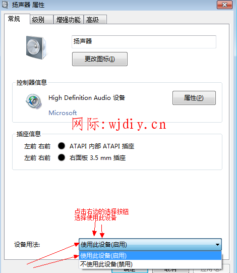 鼠標點擊中間的那個揚聲器的圖標,然后單擊右下面的屬性按鈕,會彈出來一個對話框。 著點擊右下面的那個下拉框,選擇使用此設備(啟用)